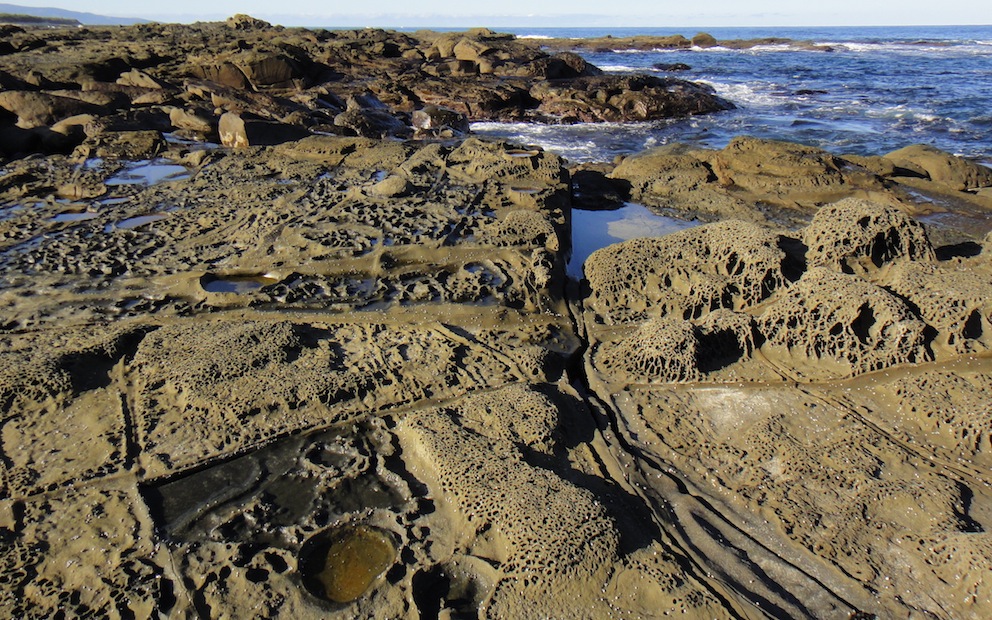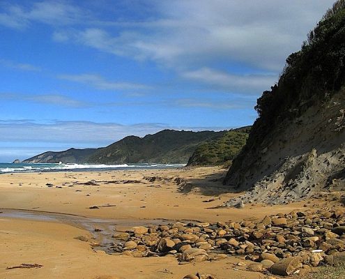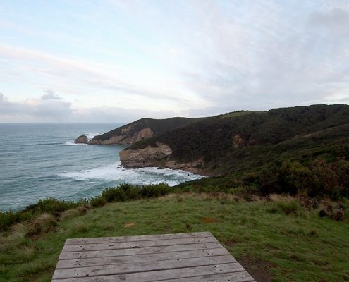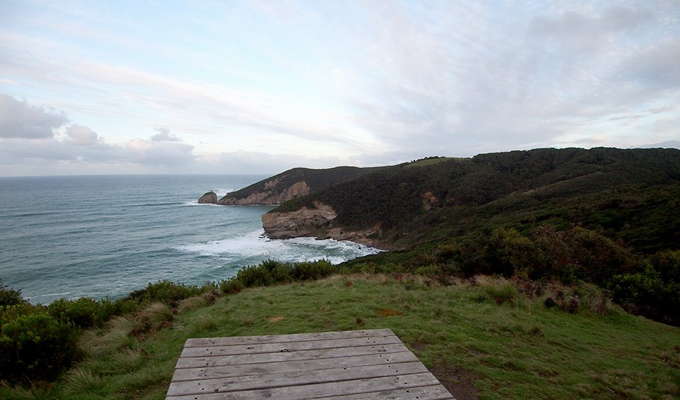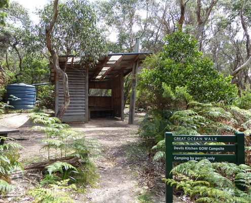 This section of the walk begins at Marengo Caravan Park. You can either choose to take the sand and honeycombed, science-fiction landscape of the rock shelves or continue on with the trail through the Caravan Park and along the foreshore and boardwalks. After the foreshore area you’ll be travelling through a more rural terrain. There’s a few ups and downs as you progress over the hills here, even a fence climb at one stage (there is a small ladder though ). After the low lying and sometimes swampy Three Creeks Beach you’ll move into a low forest initially, then just above Shelly beach you’ll climb into the higher forests of the Great Otway National Park. Soon you will arrive at a fork in the trail. If you go left you can head down to Shelly Beach; if you go right you’ll arrive at the car park area. From Shelly Beach Carpark you have the option of taking the beautiful walk down to the Elliot River mouth and a fairly steep climb up the Elliot River Track to reach the Elliot Ridge Great Ocean Walk Campsite.